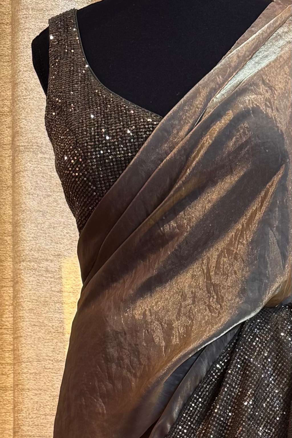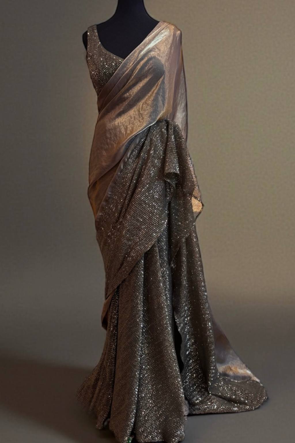 A stunning and very unique tissue and sequins wrap style saree. Fabrics are soft glass tissue in a dusty gold, and olive green sequins on stretch net.