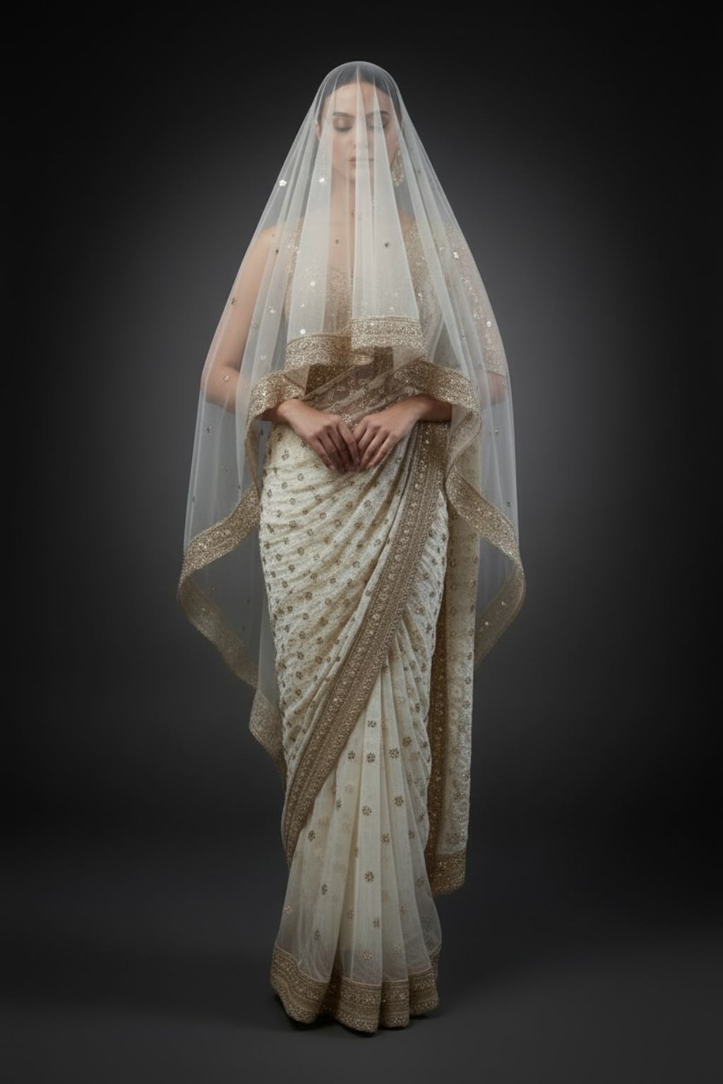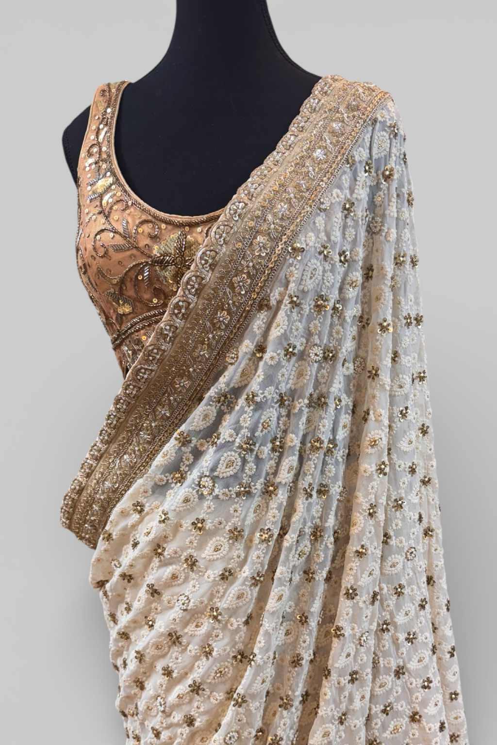 Crafted in ivory georgette, this saree features delicate chikankari embroidery, a statement gold border on the pallo, and sequins embellished resham work along its soft net pleats. A piece of quiet luxury, perfect for sacred ceremonies or styled with an ornate blouse for weddings. Saree only.